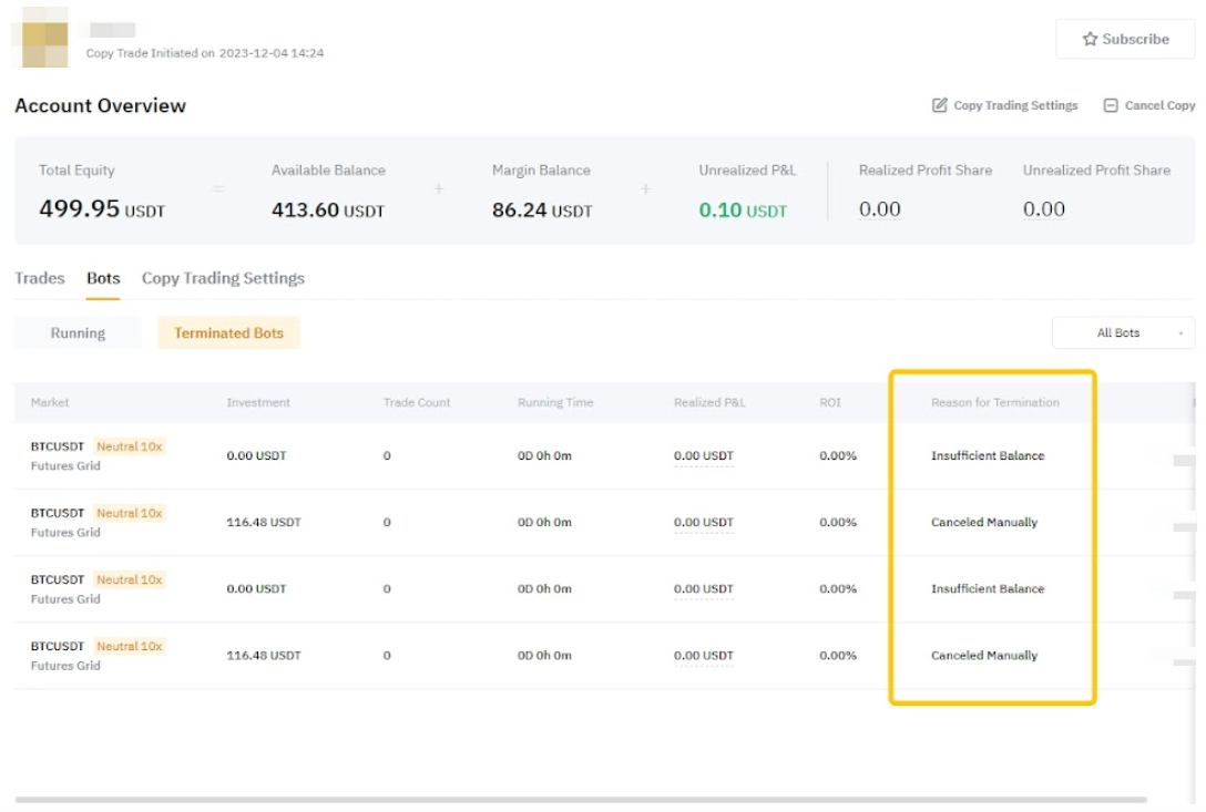 Copied trading bots are associated with Copy Trading and can only be accessed through your User Center (Follower). Self-created trading bots, on the other hand, will be displayed under the main entrance of the Trading Bot. For more information, please refer to How to Get Started with Copy Trading (Follower).