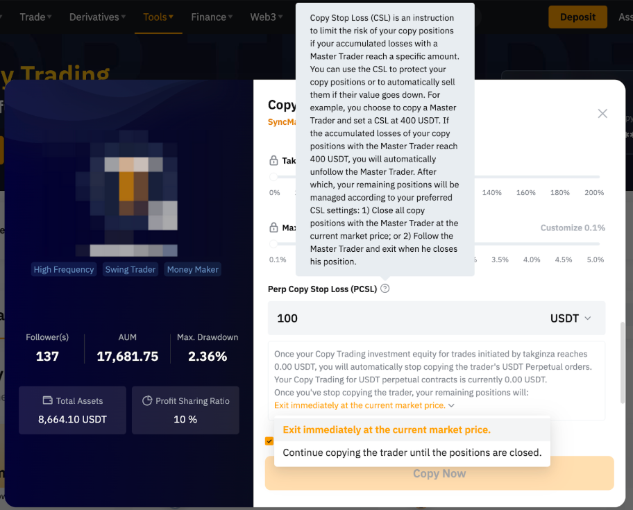 — Please note that the PCSL (Perpetual Copy Stop Loss) will only measure the real-time total of realized PNL (Profit and Loss) + unrealized PNL arising from USDT Perpetual trades as the criterion for triggering PCSL. Changes in equity resulting from profit sharing and Trading Bots will not be included in the calculation. Therefore, when PCSL is triggered, investors may potentially recover an amount less than the estimated equity level displayed on the UI.