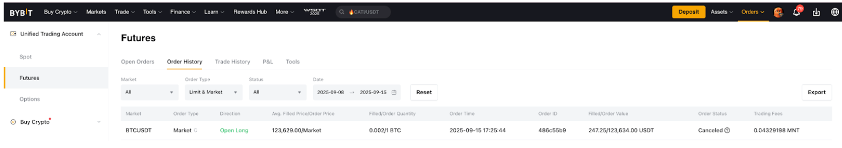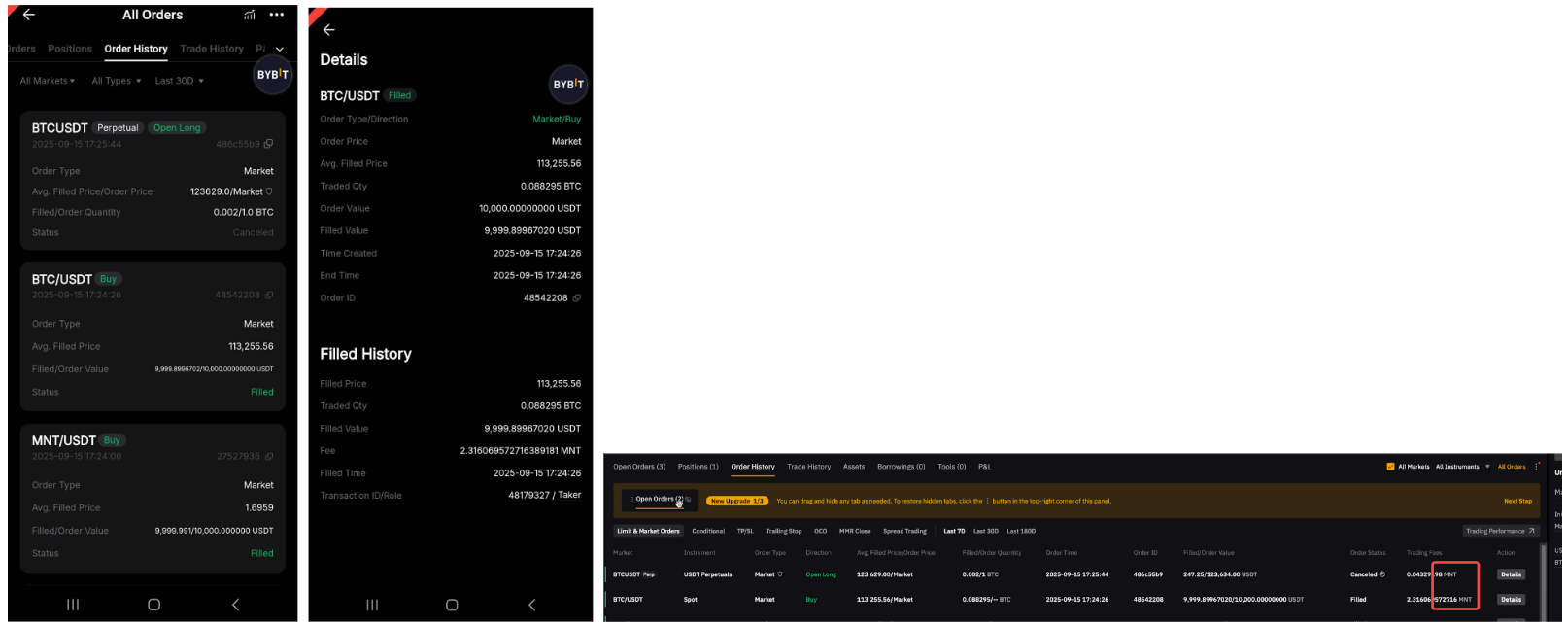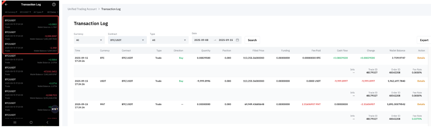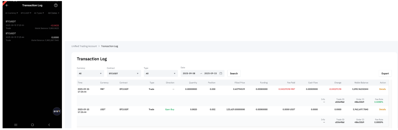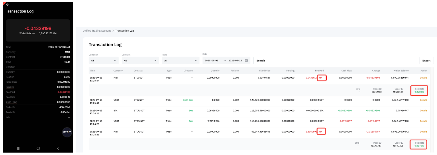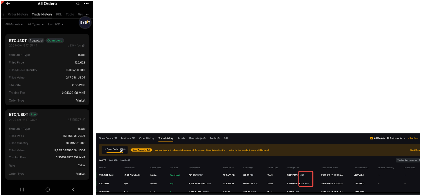 — For closed and realized P&L, any portion of fees paid in MNT will be converted back and recorded as USDT or USDC, depending on the contract type.