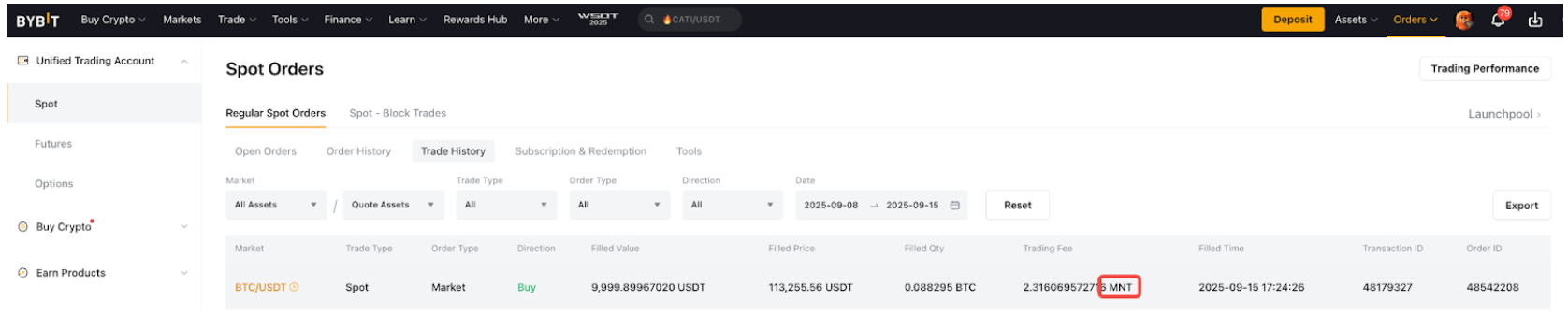 Note: Only MNT in your Unified Trading Account (UTA) can be used to pay trading fees.