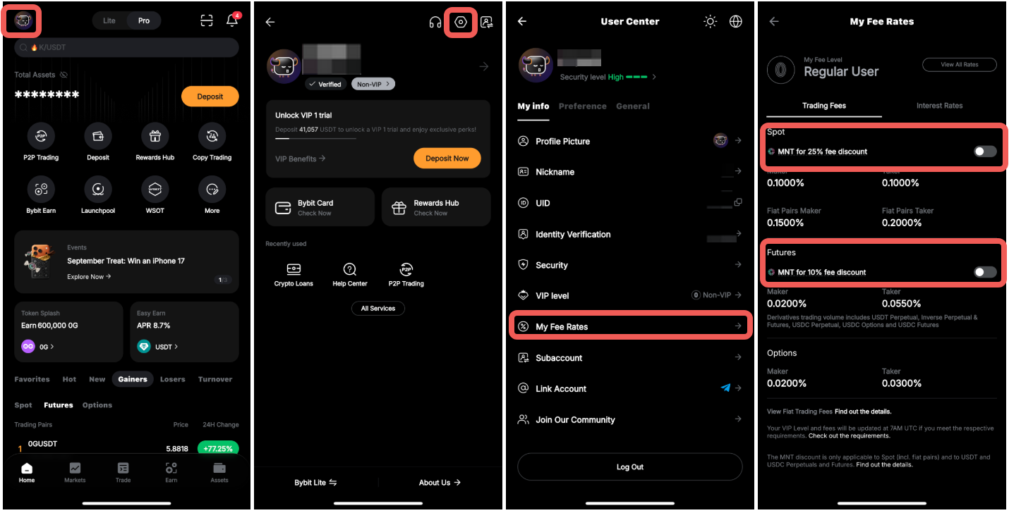 If you're using the app, follow the steps below to enable Using MNT for fee discount option.
