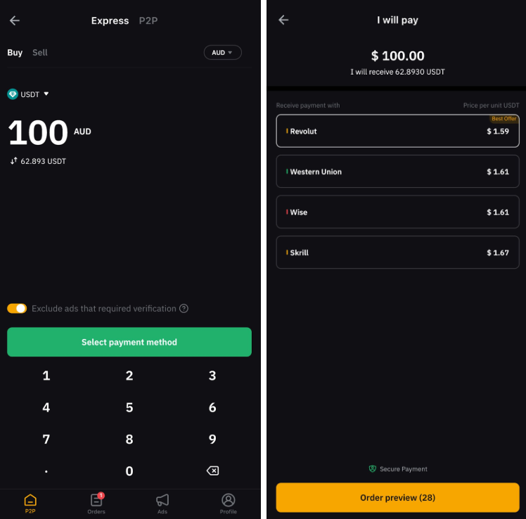 P2P Express is designed to be a fast and efficient peer-to-peer transaction, allowing P2P traders to buy crypto with other traders without intermediaries on the Bybit App. It makes it easy for beginner users to quickly get quotes without the hassle of sorting through numerous ads.