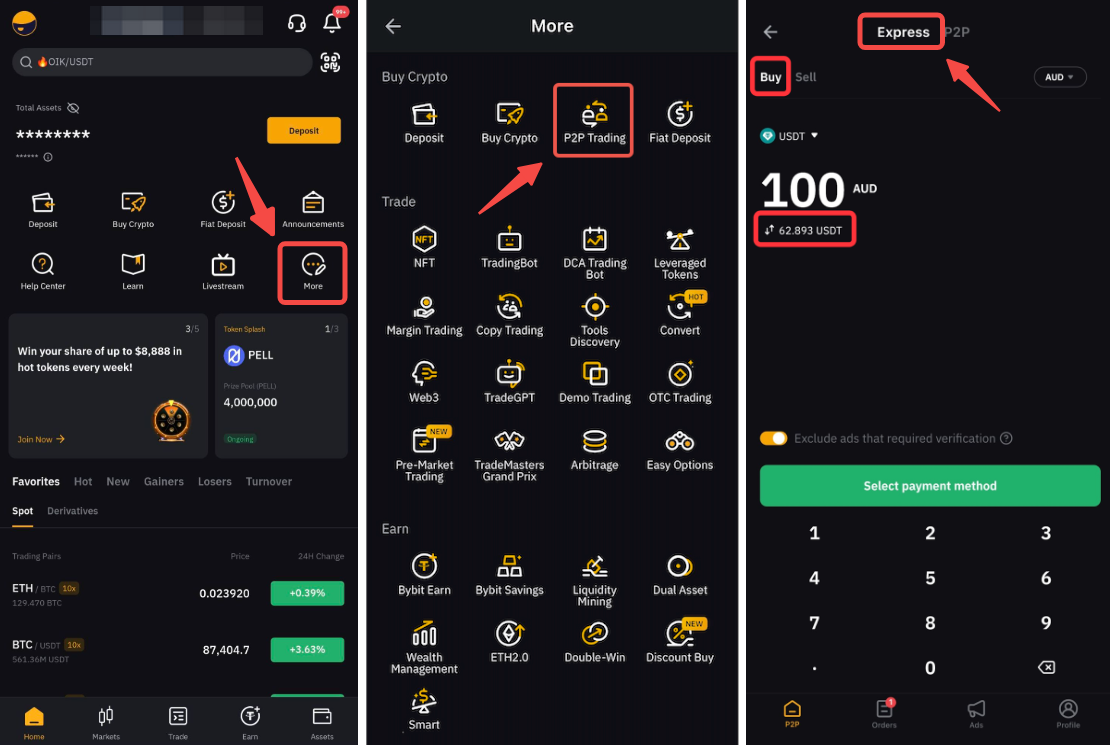 Step 1: On the homepage, please click on More → P2P and at the top of the P2P Trading page, select the P2P Express tab.