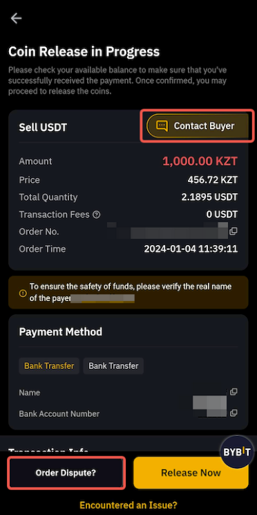 — Your bank account name must be consistent with your registered name on Bybit. Otherwise, your account might be suspended and you may encounter permanent asset loss as the seller has a right to refuse to release the coin to you.