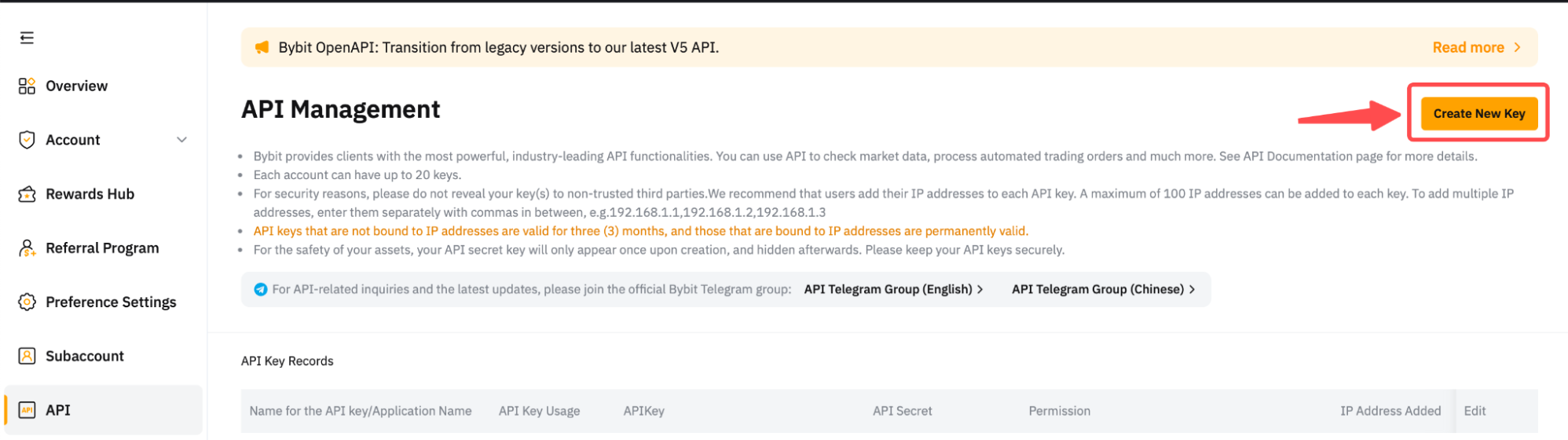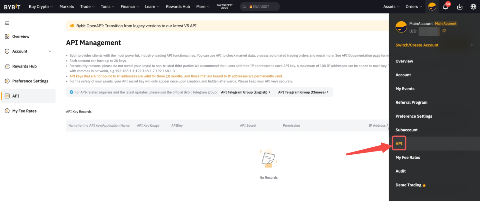 Step 1: Hover to profile icon in the top right corner on the Bybit page and click on API.