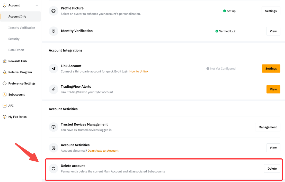 Bybit has launched a self-service account deletion feature, which allows users to delete their accounts on their own via the Account & Security page.