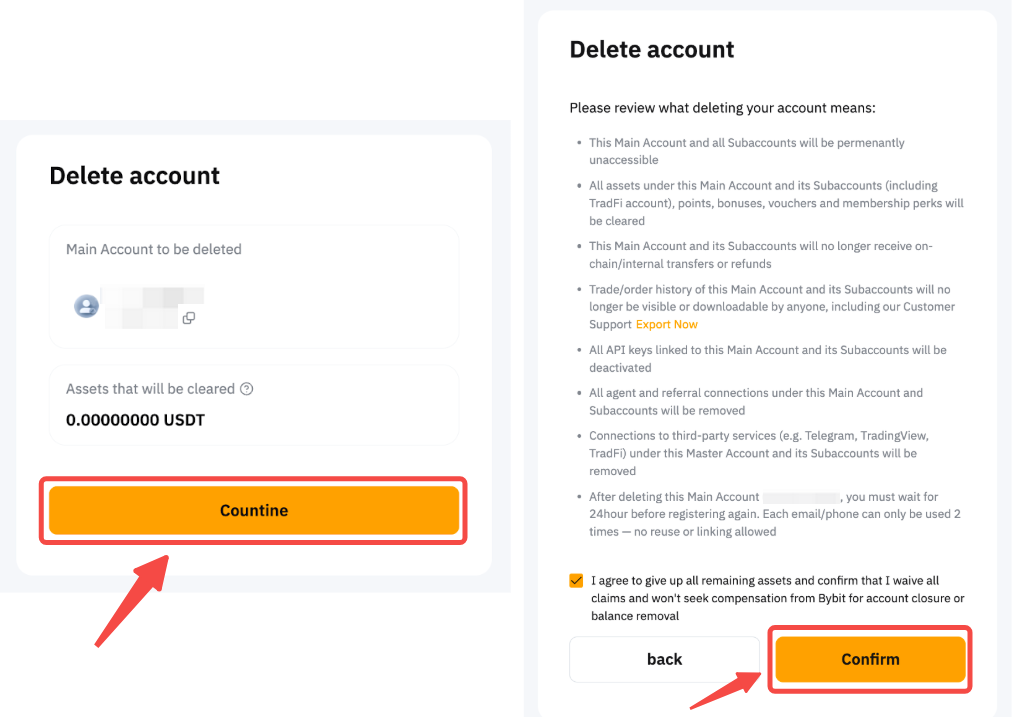 Step 2: Review and confirm the account details, including any associated subaccounts and remaining assets. Please ensure to understand the consequences of deleting your account before tapping on Confirm.