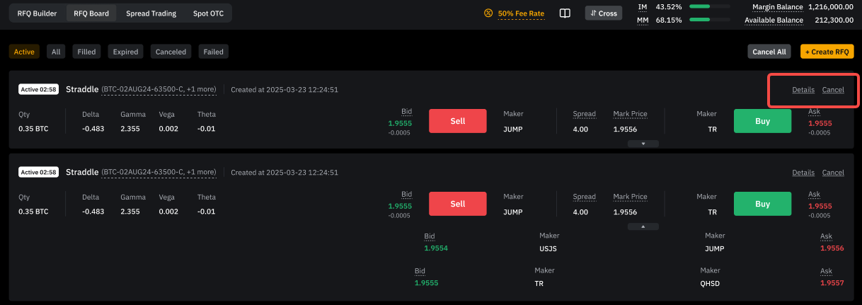 RFQ Board: View RFQs along with quotes from liquidity providers.