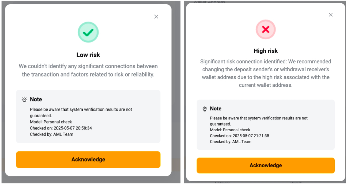 Step 3: Verify that the information is correct and click on the Check button to proceed with the verification. A pop-up message will appear with the result of the risk assessment on your deposit address.