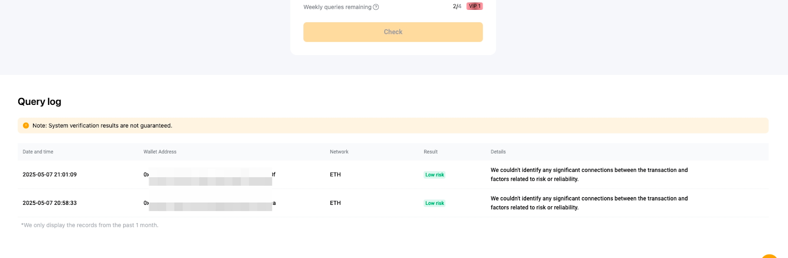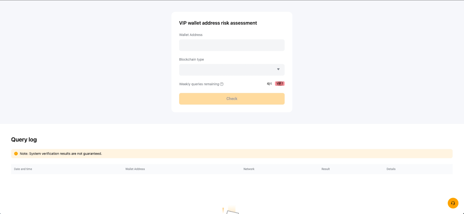 This feature is only available to VIP users. Each VIP level is granted a limited number of risk assessment queries per week, and the query quotas are reset every Sunday at 12 AM (midnight) UTC. You can upgrade your VIP level to have more frequent queries.