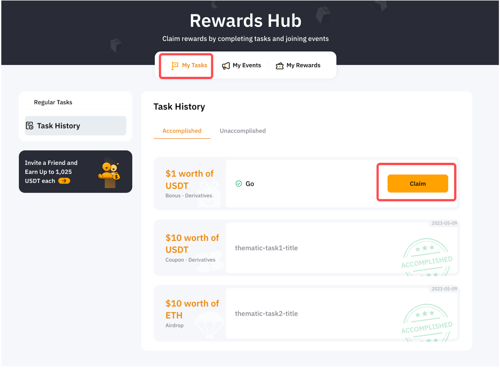 Step 2: Click on My Tasks and select Task History to claim your Bonus under the Accomplished section.