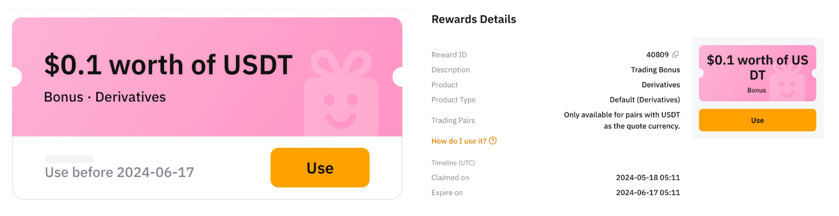• After successfully claiming the bonus, it will be credited to your account and the corresponding amount will be visible on the trading page of the applicable product. Bonuses can not be transferred to other accounts or exchanged for other assets.