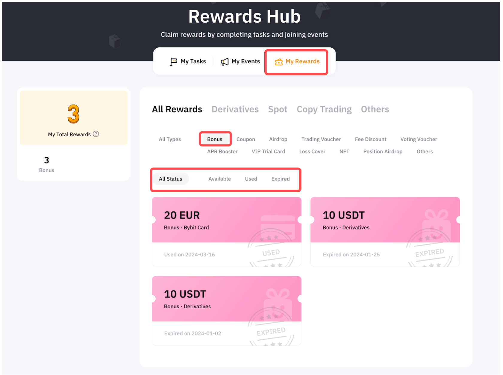 Step 3: To view the claimed rewards details, go to My Rewards and select the Bonus to check all claimed Bonus.