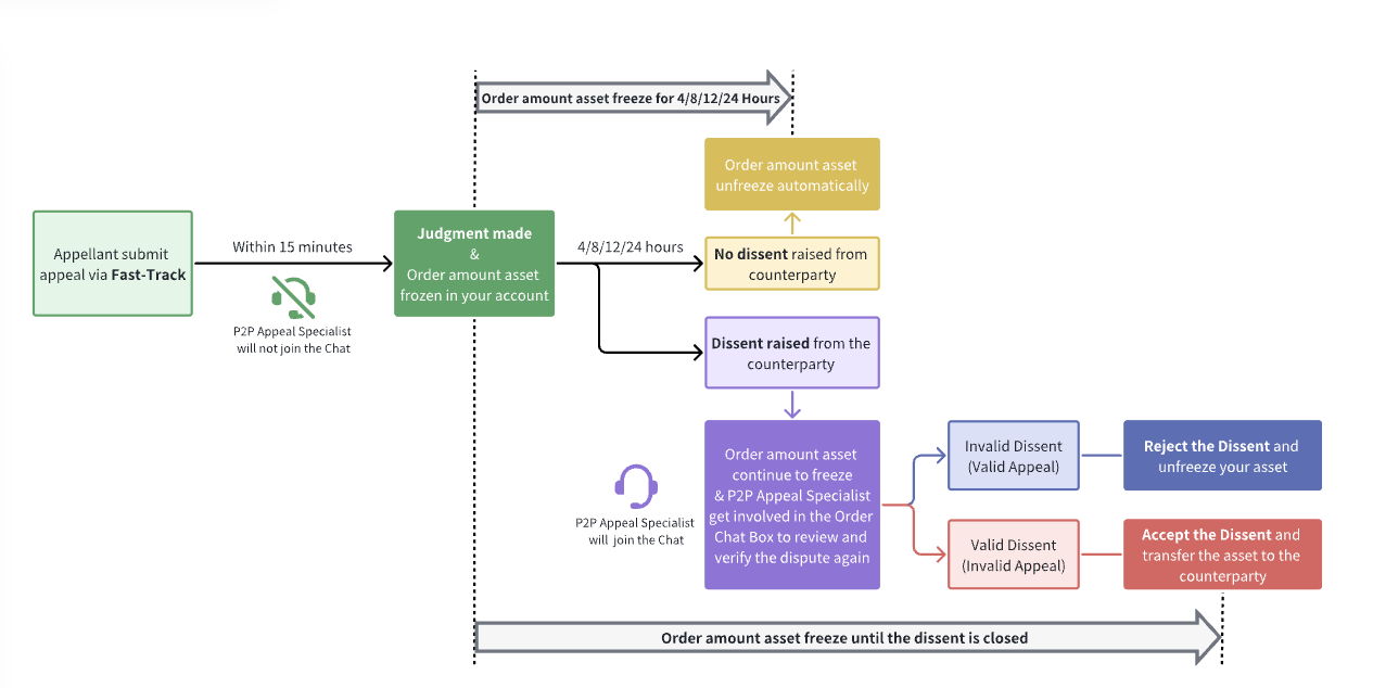 When submitting an appeal through the Fast-Track option, a judgment will be made within 15 minutes, and the P2P Appeal Specialist will not participate in the Order Chat Box. Following the completion of the judgment, the order amount will be temporarily frozen for 4, 8, 12 or 24 hours to allow the counterparty to confirm the result. The frozen duration will vary depending on the strategies. Please refer to the interface for the specific frozen duration.